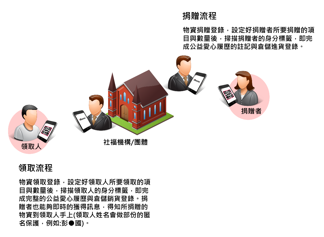 物資的進銷盡量都使用物資捐贈/物資領取的掃瞄,透過身分標籤的捐贈領取掃瞄,才能有效正確建立完整的公益愛心捐贈履歷。